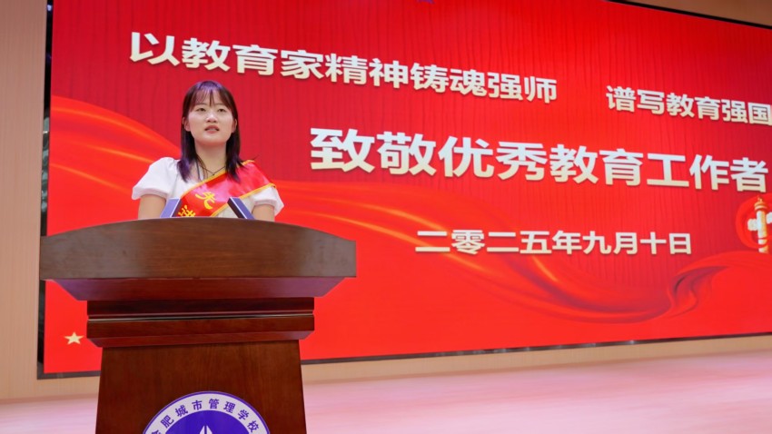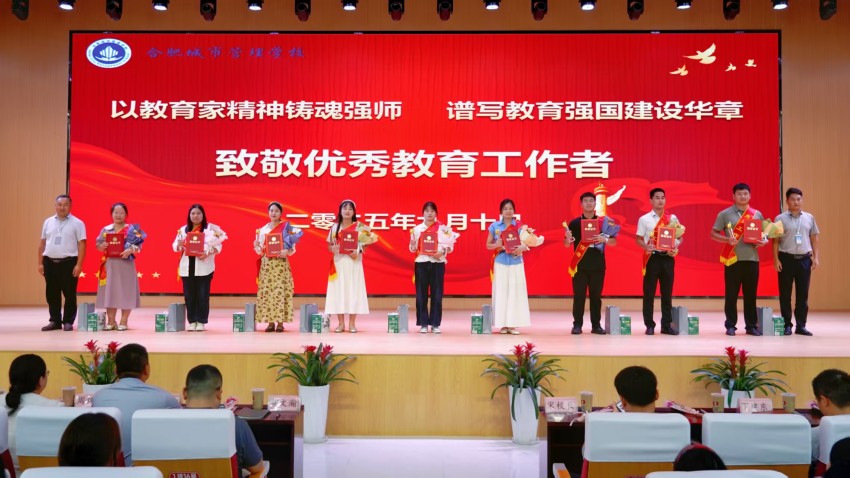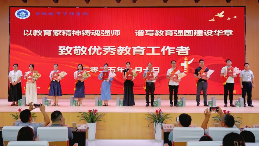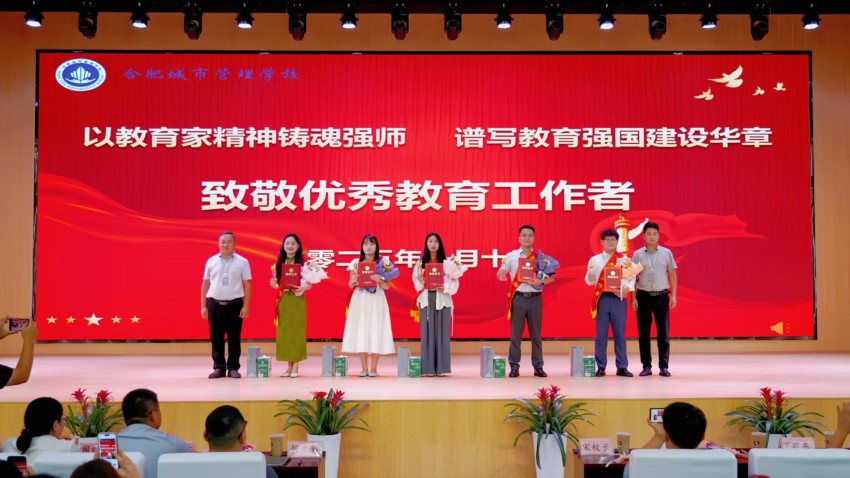 9月10日,值第四十一个教师节来临之际,合肥城市管理学校隆重举办了主题为“以教育家精神铸魂强师,谱写教育强国建设华章——致敬优秀教育工作者”的表彰大会。合肥城市管理学校校领导班子莅临大会,全体教职工以及部分学生代表共同参与了此次活动。