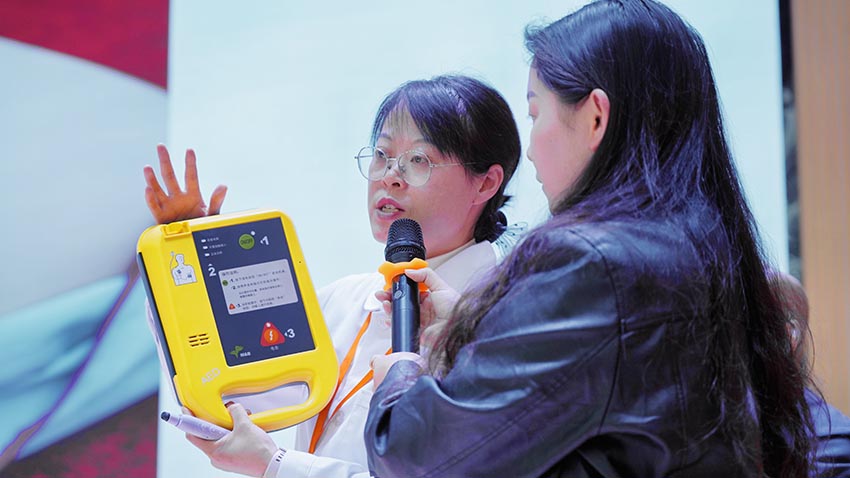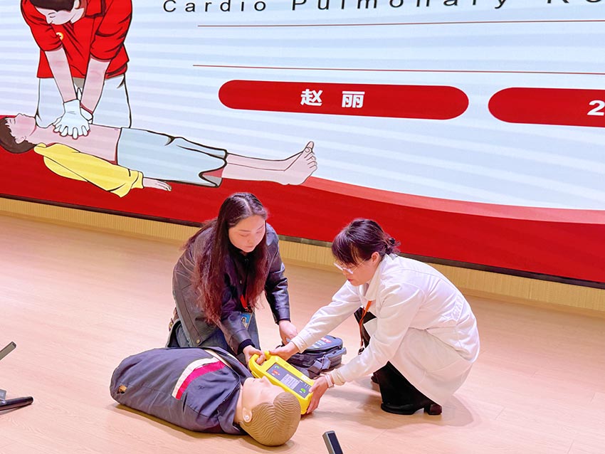 现场还针对自动体外除颤器(AED)操作进行讲解和实操演示。赵丽老师结合模拟人体模型,讲解AED开机步骤、电极片粘贴位置、心律分析注意事项及电击除颤操作要求,重点提醒施救时“所有人离开患者”的安全要点,纠正“只有专业人员才能使用AED”的认知误区。