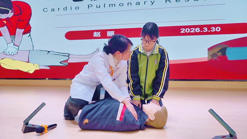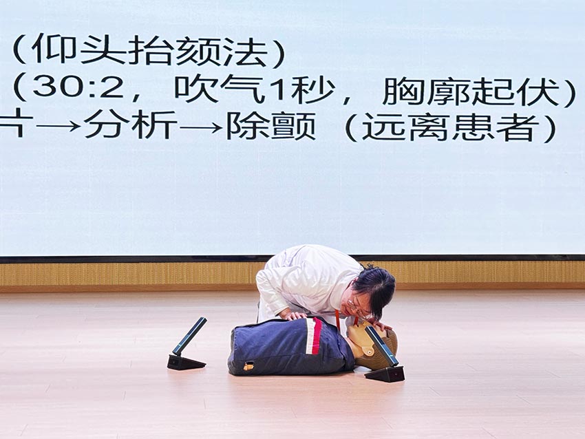 赵老师示范结束后,现场师生们踊跃举手,积极参与实操演练。大家在模拟人上反复进行练习,不断调整动作,力求做到规范。有的同学按压的力度时轻时重,在赵老师的悉心指导下,逐渐找到了节奏,每一次按压都显得沉稳而有力;有的老师在人工呼吸环节反复调整吹气的幅度,直至看到模拟人的胸廓随着呼吸自然起伏。每一次调整、每一遍重复,都是对“救命技能”的精准打磨。