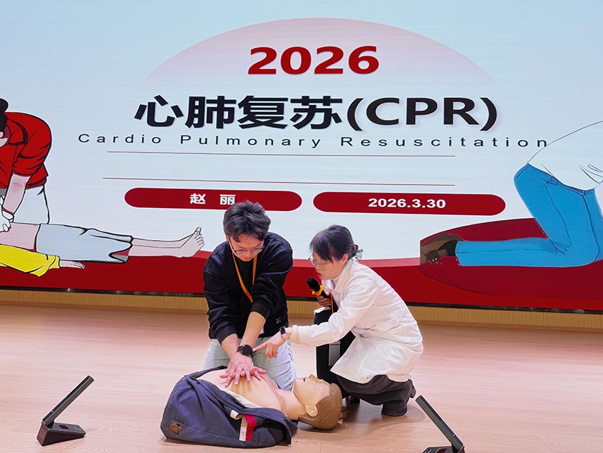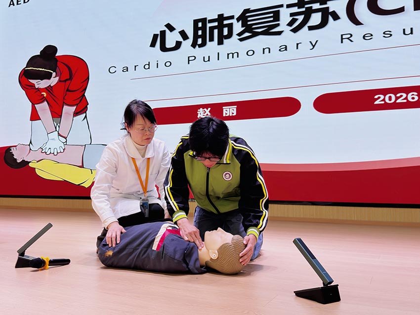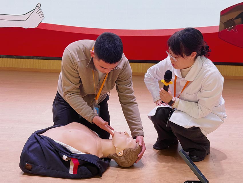 理论讲解结束后,心肺复苏实操培训随即展开。演练现场,赵丽老师首先进行标准操作示范。她站在模拟人旁,边操作边讲解:“先判断环境安全,再轻拍患者呼喊以确认意识。”随后她演示呼救流程:“快来人,有人晕倒,麻烦打120并取AED!”